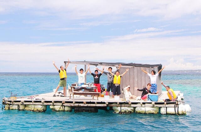 沖縄本島北部の沖に浮かぶ「イカダ」を貸切!BBQ、釣り、カヤックなど自由にお楽しみ。美ら海水族館から車で約10分の港から出発し、イカダ滞在中も、地元うみんちゅが完全サポート。3歳以上のお子様もOK♪