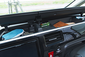 運転席ハンドルの前部分は浅めの収納スペースになっており、財布や鍵などポケットの中にあるものを収納することができます。