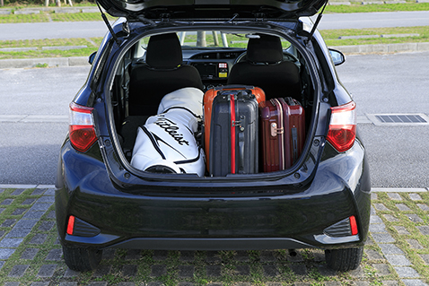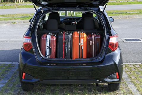 深さがあるので、後部座席を倒さなくてもSサイズのスーツケースが4つ入ります。この時の最大乗車人数は5名です。