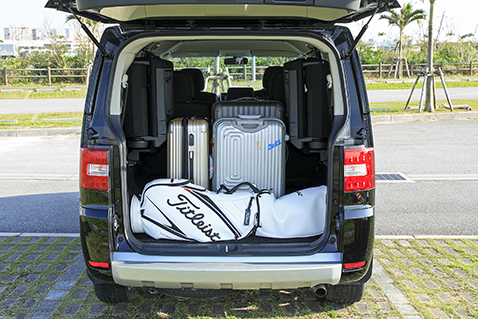 ゴルフバッグは寝かせて収納するとほかのスーツケースが入ります。この時の最大乗車人数は5名です。