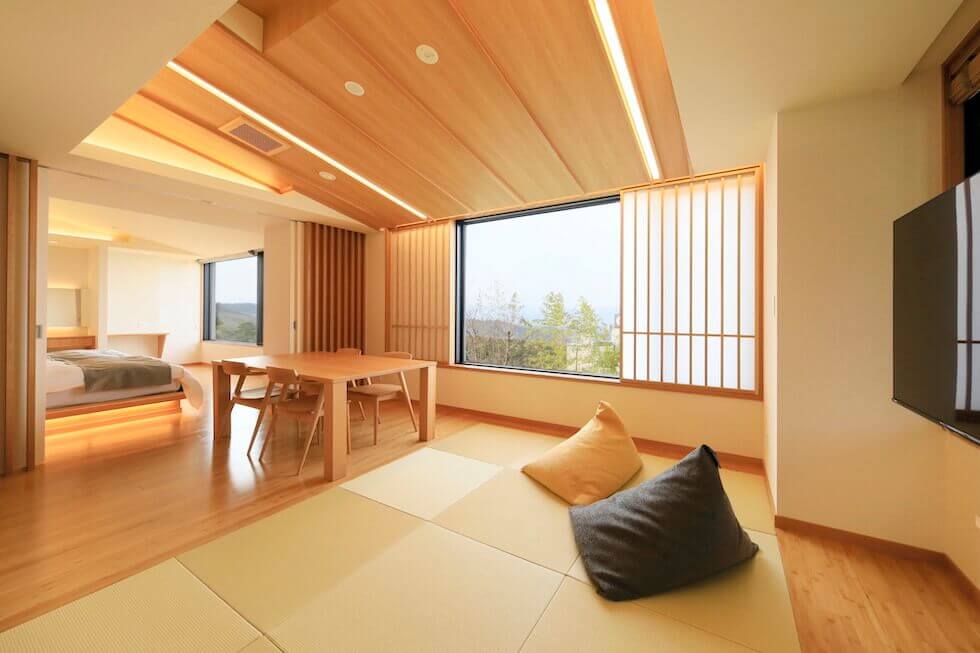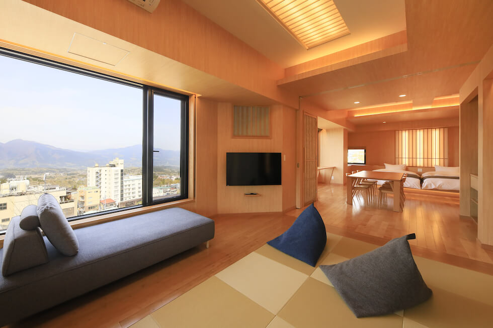 客室は、全14タイプ・74室。温泉付きスイートが7室、和室タイプが62室、ツインベッド客室が5室と、多彩なラインアップ。バリアフリー対応の客室も7部屋あり、車椅子のゲストや高齢者でも安心です。カップルや夫婦の、家族二世代・三世代、グループ旅行など、「来た人みんなが心地よく過ごせる旅館」です。