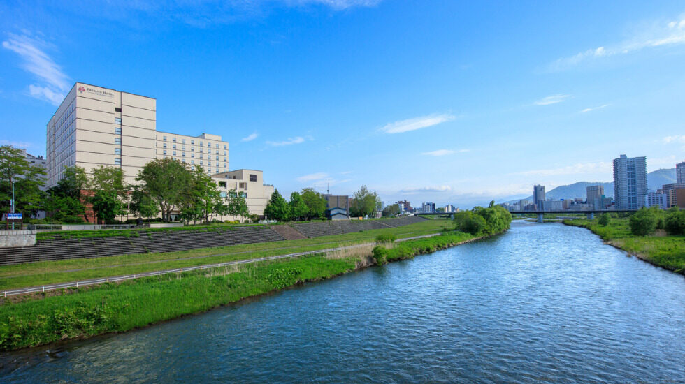 国道36号線沿い、緑豊かな豊平川を眼下に望むホテルは、ススキノエリアにも徒歩圏内、それでいて閑静な立地が魅力です。豊平川は河畔の遊歩道やサイクリングロードなども整備されているので、空き時間に散歩してみるのもいいかもしれません。また、新千歳空港発着の空港連絡バス停留所はホテル目の前。札幌駅北口とホテルを結ぶ無料シャトルバスも運行しているので中心部との行き来が便利です。車利用の場合に便利な地下大型駐車場は有料。ホテル地下直結なので、雨や雪の日も濡れずに移動できるのがうれしいですね。ホテルの目の前にはコンビニがあり、ちょっとした買い物にも便利。