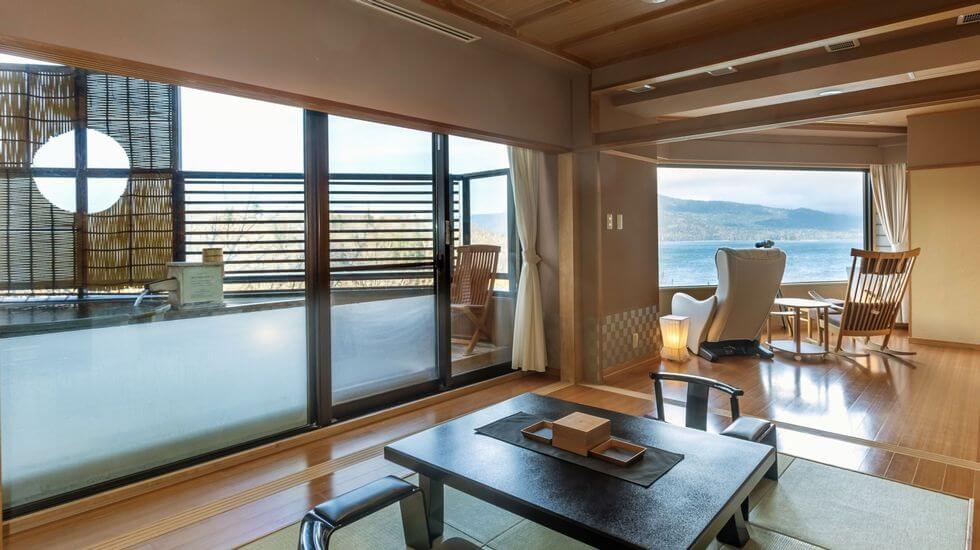 「あかん鶴雅別荘 鄙の座」は、阿寒での贅沢な温泉旅を思い描く方におすすめのホテル。館内には大浴場も2カ所あるので、大きな湯舟にどっぷり体を沈めるのもいいでしょう。檜造りの露天風呂からは、阿寒湖や雄阿寒岳が広がる眺望を楽しむことも。また、客室は全室60平米以上のスイートルームで、大切な人と特別な時間を過ごすのにふさわしい雰囲気。5タイプある客室の全てに温泉露天風呂が備わっているのもうれしいポイントです。和とラグジュアリーさが調和する室内で、目の前に広がる阿寒湖をぼんやりと眺める時間は贅の極みと言っても過言ではありません。客室タイプによっては、夕食を部屋食に変更することもできますよ。あかん鶴雅別荘 鄙の座は、温泉に食事、微酒、おもてなしと全てが揃う憧れの温泉ホテルです。