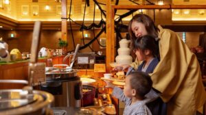 自社ファームで採れた野菜を使ったメニューが並ぶビュッフェには、チョコレートファウンテンなどデザートが充実。ハンバーグや唐揚げ、コーンピラフなど、子どもが喜ぶメニューも並びます。子ども用のイスやカトラリーもしっかり揃っているので、子どもを連れた温泉旅行にぜひ。
