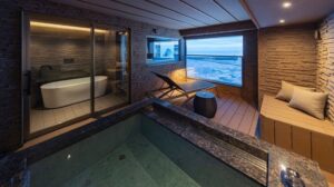 【知床】北海道を代表する人気スポット、オホーツクの海が見える客室露天風呂なら、冬に流氷が見られるかも。オホーツク海に面した「北こぶし知床 ホテル&リゾート」では、3タイプの客室で、海が見える客室露天風呂が楽しめます。中でも「サウナ付きスパスイート」は、北海道の絶景ロケーションを味わえるおすすめの客室。最上階にあるから海の眺望も格別、しかも、セルフロウリュ式のサウナと水風呂も付いているんです。客室露天風呂には、海が見える「ととのいスペース」も完備されています。100平米もある北欧風の室内には、温かな雰囲気を醸し出す暖炉。ロッキングチェアやデイベッドで、ラグジュアリーな北海道の旅を仕上げて。