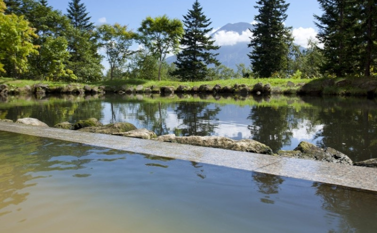 【北海道/ニセコ】蝦夷富士・羊蹄山(ようていざん)の麓に位置する「ヒルトンニセコビレッジ」。羊蹄山の絶景が楽しめるのは露天風呂も例外ではありません。露天風呂の目の前の大きな池では鯉が優雅に泳いでおり、肩までゆっくり湯に浸かればまるでインフィニティバスさながら。池の周りには木々が生い茂り、夏は緑、秋は紅葉、冬は雪景色に目をやりながら露天風呂での時間を満喫できます。ニセコの豊かな自然と一体化したような感覚で、絶景温泉を存分に楽しみましょう。また、露天風呂・内湯ともに、湯量豊富な自家源泉を贅沢にかけ流しで堪能できるのも魅力。循環ろ過は行わず湯温調整の加水だけに留めています。