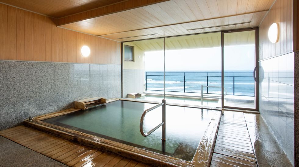 【北海道/函館・湯の川温泉】創業当時より湧き出る自家源泉をかけ流しで楽しめる老舗旅館「割烹旅館 若松」。オーシャンフロントの大浴場には砂浜に面した露天風呂があり、潮騒の音に耳を傾けながらリラックスできますよ。チェックインの少し後に訪れれば美しい夕日が、夜になれば波音とともに満天の星を眺められます。また、夏の夜は漁火を楽しむことも。大浴場は男女別に各1カ所ずつ。男性浴場は御影石、そして女性浴場は古代檜を使用した内湯で、大きな窓から広がるオーシャンビューを眺めながら湯浴みを堪能できますよ。海に面した絶景温泉に身を委ねて、旅の疲れを癒やしてくださいね。