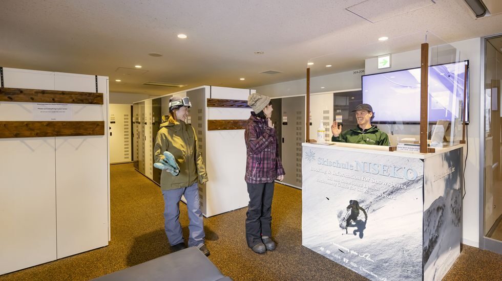 ニセコの中心部・ひらふ坂の中腹に位置するシャレーアイビーヒラフ。冬は専属のスキーコンシェルジュが在籍し、スキー用具のレンタルやスキーレッスン、アクティビティの予約などをサポートしてくれます。ルーム番号が記載されたスキーロッカーもあるので便利ですよ。また、スキーコンシェルジュのドアから外に出ると、順次運行しているニセコ東急 グラン・ヒラフまでの無料シャトルバスに乗ることができます。スキーの後は、オーナー特製のホットな”アップルサイダー”と宿泊者専用の温泉でポカポカに。