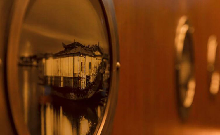 「Sovereign(ソブリン)」は、船内にあるキャプテンルームを思わせる雰囲気のバー。店名の由来となった、イギリスの軍艦・ソブリン号のジオラマが飾られています。店内は船床のようなフロアや、世界の港がデザインされた丸窓のおかげで、航海に旅立つ船に乗船しているよう。また、こだわりのバーカウンターはケヤキの一枚板で作られ、8メートルの長さを誇ります。木のぬくもりを感じながら、好みのアルコールをオーダーして。ラムやジン、ワイン、ウォッカなどをベースにしたカクテルは、メニューも多彩。種類が豊富なアルコールを、小樽切子のグラスで味わえますよ。9席のカウンターのほかに、テーブル席もあります。