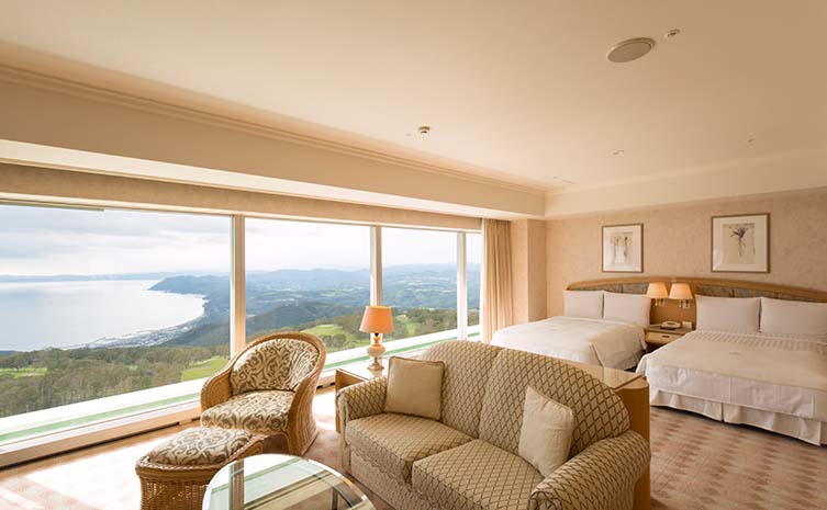 ジュニアスイートなら何時にチェックインをしても24時間滞在が可能。大きな浴槽を備え、バスソルトやシートマスク、バスローブの他、「BVLGARI」のバスアメニティもそろいます。上質なソファやチェアに腰かけて、洞爺湖を眺めながらくつろぐのもおすすめです。「杜氏賛歌(とうじさんか)」では契約農家から仕入れた野菜など、素材の良さを引き立たせた割烹料理の夕食が味わえます。ハモやツブなど旬の魚介の豪華な刺身は、2008年の洞爺湖サミットで各国首脳に贈答された「将進酒」と共に楽しんで。