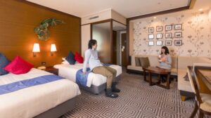 JR札幌駅南口から徒歩約5分。札幌市時計台やさっぽろテレビ塔にほど近く、観光目的の旅にぴったり。フロントロビーは2階にあり、館内に入るとアロマのイイ香りが漂ってきます。ホテルにはコンシェルジュがいるので特別な日の滞在でも安心。客室デコレーションやレストランでの演出なども事前に相談してみて。