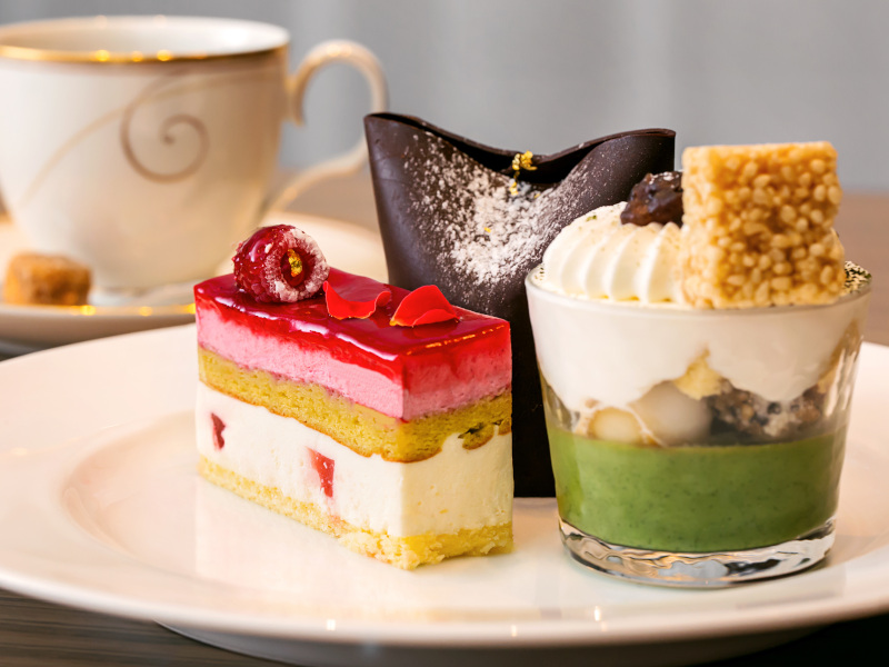 宿泊滞在で利用する機会がありそうなラウンジ営業では、ホテルメイドのスイーツやドリンク、軽めのフードを提供。ショーケースいっぱいに並べられたケーキはどれも華やかで工夫を凝らしたものばかり。パリッとしたチョコレートにフォークを入れるとチョコレートムースと生クリーム、オレンジピールが重なり合う濃厚な「アルミュール ショコラ」、シュワッと溶ける甘酸っぱいイチゴのムース&ソースが女性の心をつかむ「ベリーフロマージュ」、雷おこしが意外なアクセントの白玉入りの「抹茶パフェ」は特におすすめです。テイクアウトも可能なので、カトラリーを借りて客室で楽しむこともできますよ。