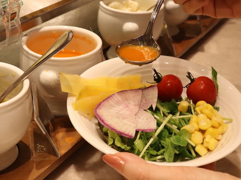 サラダコーナーには水菜やトマト、キュウリ、コーンなど瑞々しい野菜がいっぱい。和風やポン酢などスタンダードなものに加え、イタリア塩・パクチー・ニョクマム・バーニャカウダ・ハスカップ・山わさび・南イタリア風など豊富なドレシングが揃っていました。