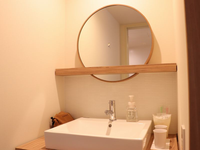 この部屋の魅力はそれだけにあらず。バス・トイレセパレートタイプとなっていて、使い勝手の良い洗面台には大きな鏡も。