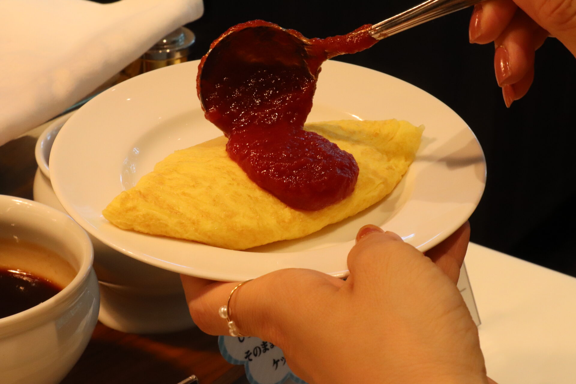 たびらい女性スタッフが気になったのは、フワフワのオムレツ! 目の前で一つひとつ丁寧に作ってくれるオムレツは白老産たまごを使用しており、ケチャップやソースをかけても負けない、濃厚な味わいが特徴なのだそう。