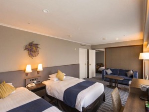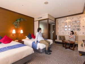 15階~21階の高層階にあるファミリールームは、2部屋をコネクティングにした61.4平米。ゆったりとした造りで、各室に120センチ幅のベッドを2台ずつ設置。エキストラベッドを利用すれば、最大6名まで宿泊が可能。40インチの液晶テレビやソファ、サイドテーブルがそれぞれの部屋にあるのも嬉しい。
