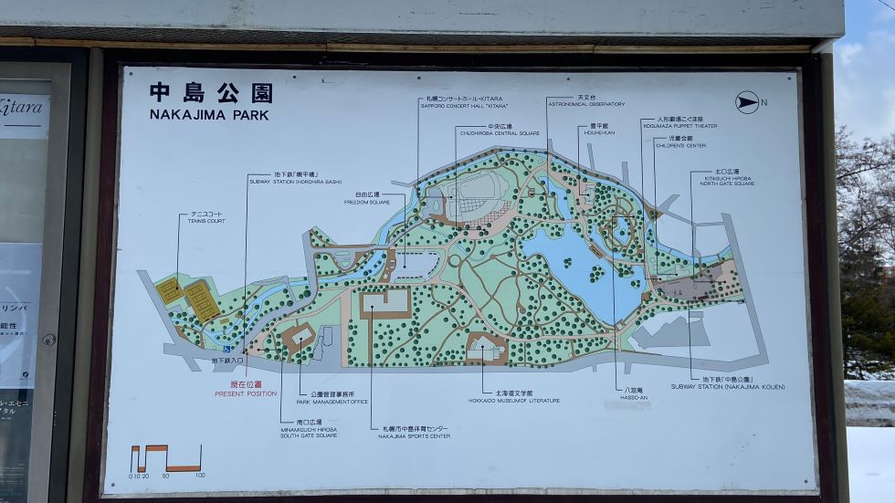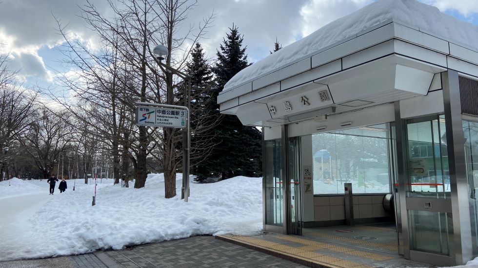 スノーシューをレンタル予定なら、地下鉄「幌平橋駅」側にある中島公園管理事務所へ。「幌平橋駅」1番出口から、徒歩約2~3分で行けます。中島公園は縦に広い公園で「中島公園駅」「幌平橋駅」が最寄り駅。冬は寒いので、地下鉄を活用して移動するのが便利ですよ。