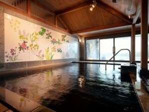 渓谷と深い森に囲まれ、温泉を堪能。壁画が印象的な和風呂も