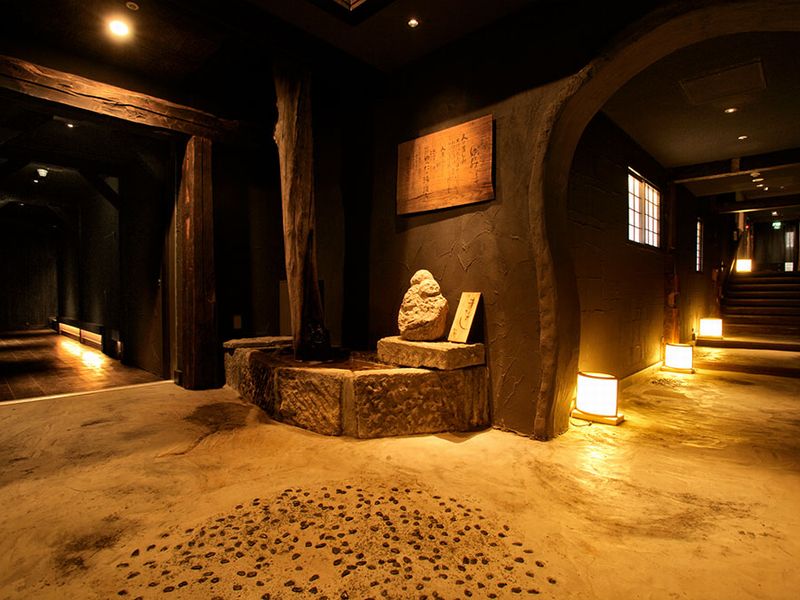 野趣溢れる岩造りが印象的な「法灯の湯」。男女それぞれの浴場に浴槽は1つのみで、日替わりで入れ替えとなります。どちらも静かな安らぎの中で温泉を楽しめるのが特徴で、夜は幻想的なライトアップを楽しめます。