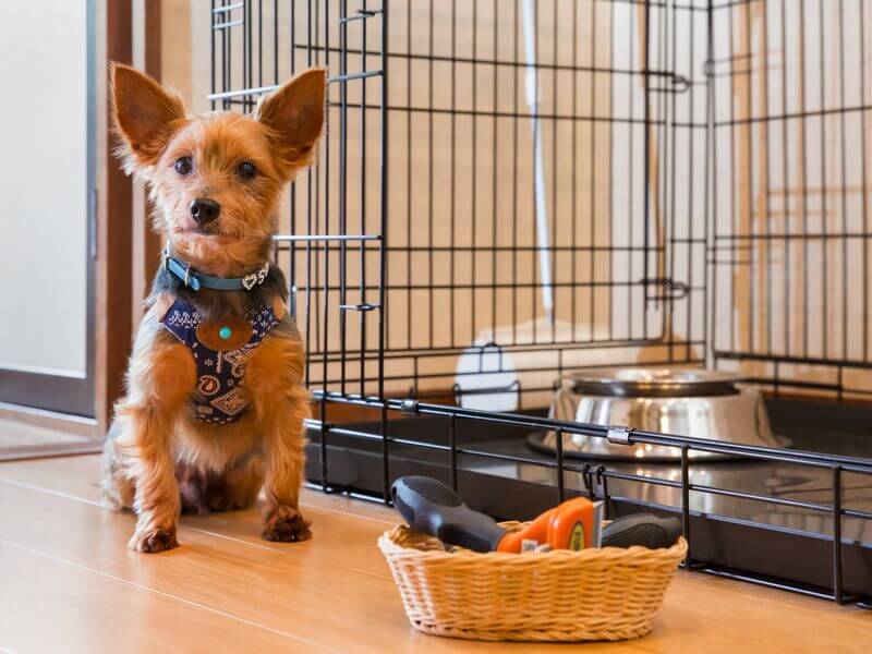 部屋の中には、ケージや食事用の食器など備品も揃っています。ワンちゃんが落ち着けるよう、自宅で使用しているおやすみマットなどを持参するのもおすすめ。
