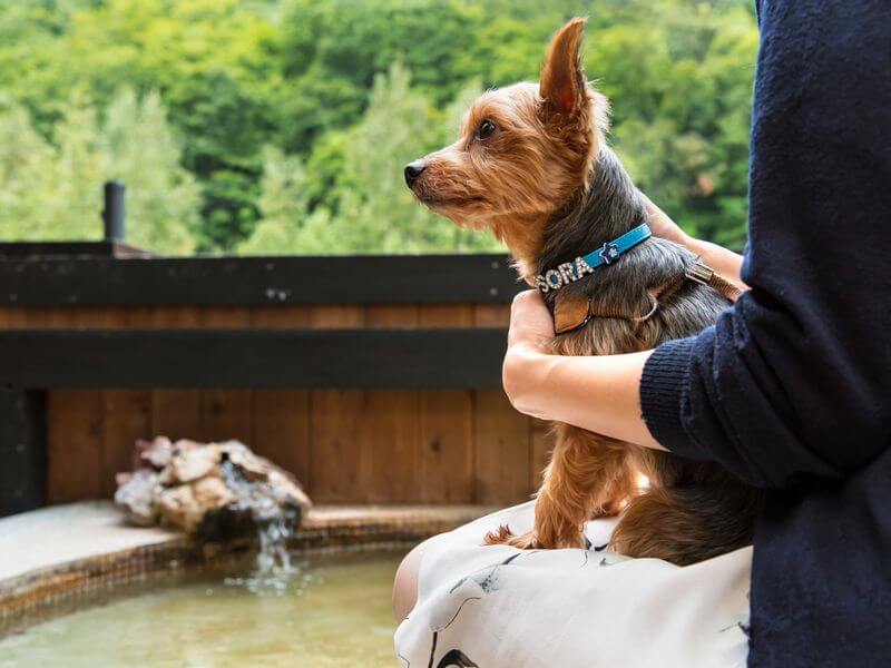 温泉でのんびりしたいけど、ペットを置いて行けないという方におすすめの「ぬくもりの宿 ふる川」。一緒に寛げる部屋は34平米の和室にサンルームがあるタイプと、63平米で足湯がある和洋室の2つ。和室+サンルームは4.5畳の和室にリビングとサンルームがあり、サンルームはワンちゃん専用のデッキになっています。デッキには足洗い場があるほか、ケージや水受けなどの備品も用意されています。