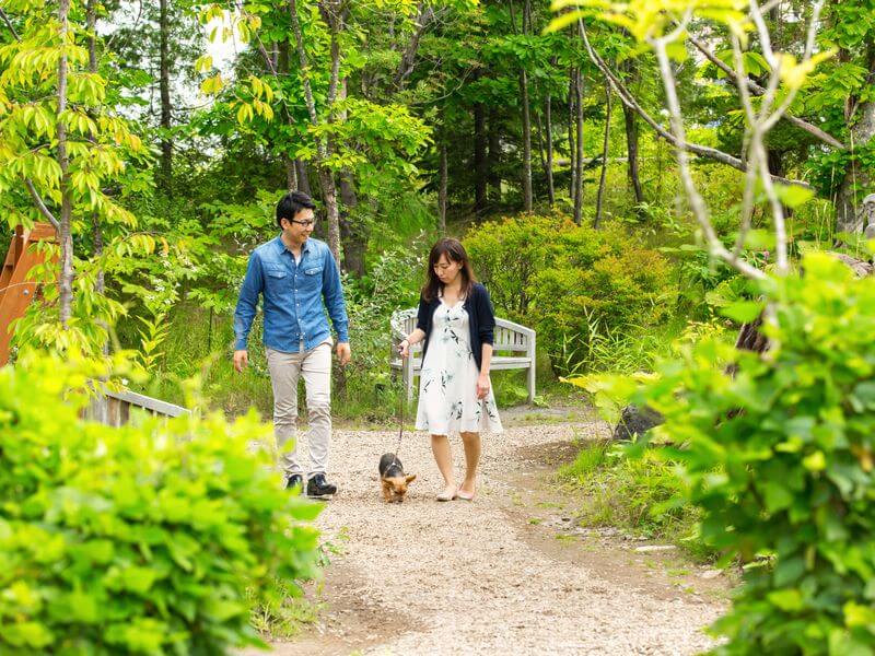 散歩には宿裏の「心の里 定山」にある定山の森へ。ベンチがあるので、座ってのんびりとした時間を楽しむのもおすすめです。散歩の後は、宿の入り口の足洗い場で、サッと汚れを落とすことができて便利です。