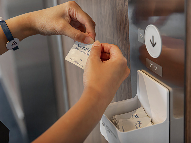 各エレベーター前にはアルコール除菌シートがあるので、ボタンを拭いてから押すことができますよ。エレベーターの中を始め、ゲストが集まりやすい場所にはソーシャルディスタンスを保つための足跡マークも設けられています。