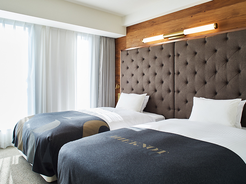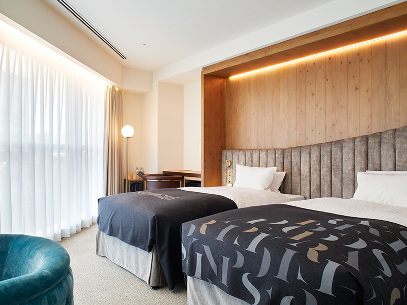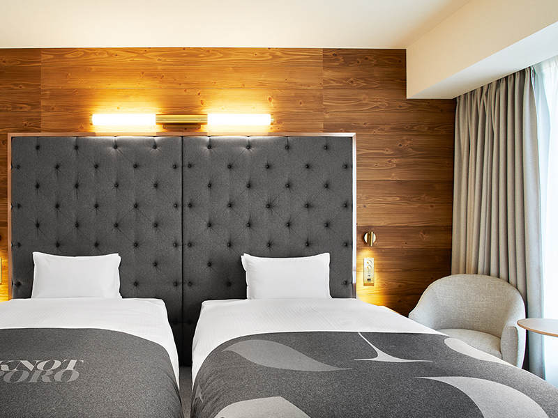 スタンダードツインルームなど一部の客室には、ヘッドボードに道南杉を使用しています。またベッドのサイドテーブルに札幌の開拓時代を支えた札幌軟石が使われているのも、この土地ならではのメッセージを伝えてくれます。