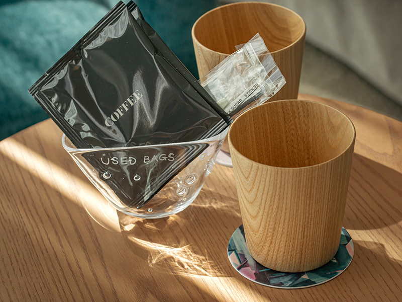 各部屋には旭川・高橋工芸の木製のカップが。ドリップコーヒーと北海道産のミネラルウォーターもセットされているので、窓から札幌の街並みを眺めながら、くつろぎのひと時を過ごして。