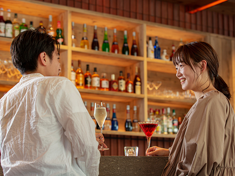 ディナー後、もう一杯飲みたいという時もレストラン「LES BOIS(レ ボア)」へ。札幌軟石のバーカウンターに座って旅を振り返るひと時を楽しんで。ノーチャージなのも気軽さを誘います。