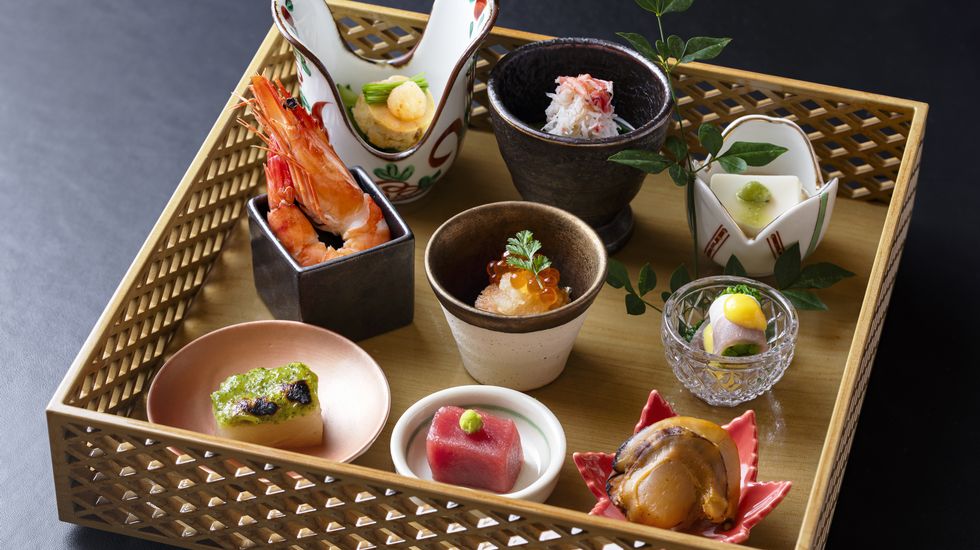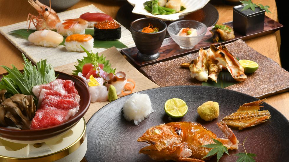 「北海道懐石」では道内各地の地方料理から着想を得た逸品を味わって。炭火で焼いた道産牛や牡蠣、小鍋や握り寿司もあり、北海道の恵みを余すところなく堪能しましょう。コースのメインは、炭火でじっくり旬魚を焼く「原始焼き」です。