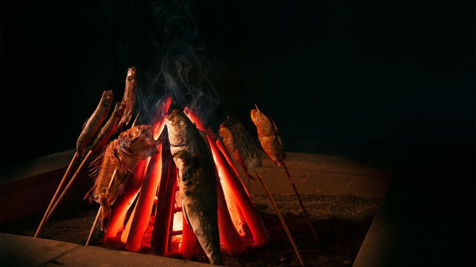 原始焼きとは、串に刺した魚や野菜を囲炉裏を囲むように並べ、炭火でじっくりと焼き上げる調理法のこと。シンプルでありながら技術が必要な難しい火入れ方法です。時間をかけて火入れをすることで、魚の水分と脂が落ち旨味が凝縮されるのだそう。原始焼きの囲炉裏はカウンター越しに眺められるので、カウンター席に座れば調理の工程も楽しめます。