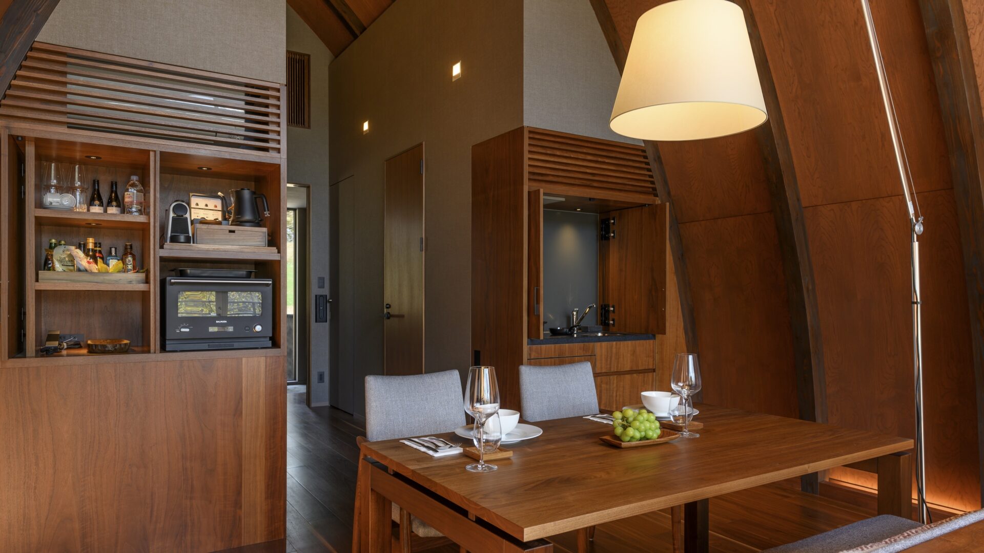 エントランスから奥に進むと、窓の外に見える美しい白樺の木々が目に留まります。室内に差し込むやわらかな日差しとほんのり香る天然木の香りが心地よく、心洗われる癒やしのひとときがスタート。オリジナルのチョコレート菓子のほか、アルコールやソフトドリンクなど、ゲストの好みに合わせたフリードリンクで到着後の一杯を楽しんで。リビング&ダイニングスペースにあるミニキッチンには、バルミューダの電子レンジ、Chemexのコーヒーメーカーなど、おこもりステイに欠かせない設備も充実しています。