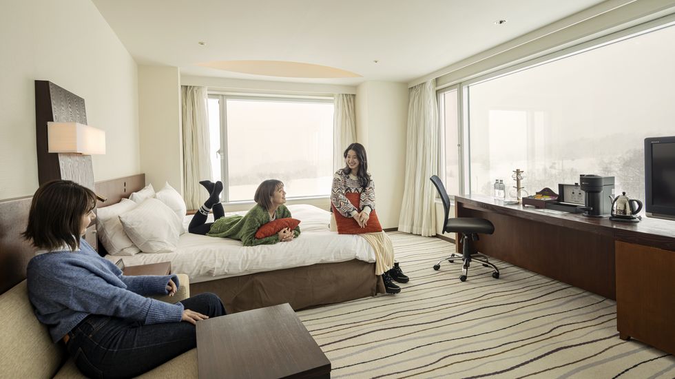 グループや友人同士での旅行なら、最大4名まで宿泊できるデラックスパノラマルームがおすすめ。各階の角部屋にあたり、2面に続く大きな窓の外には、ゲレンデが。大勢の宿泊客がスキーを楽しむ様子を眺められるのも楽しいですよ。