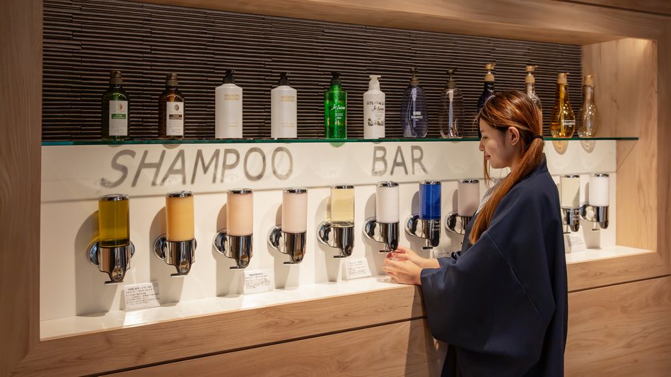 入浴タイムをより充実させてくれるのが、「シャンプーBAR」。まるでコスメサロンのようなディスプレイです。お気に入りのシャンプーとコンディショナーをじっくり選ぶのも、楽しみのひとつですね。