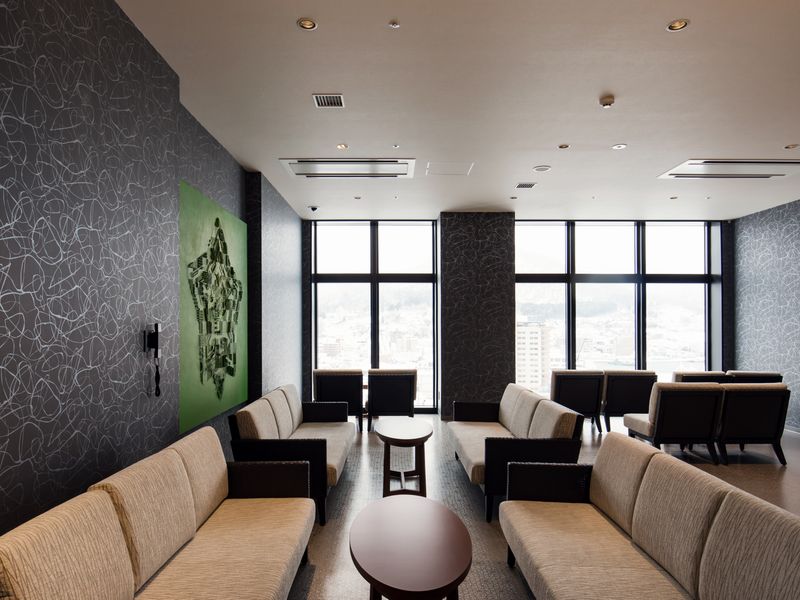 こちらは、同じフロアに設けられた湯上り処。窓に向かって配置されたソファは、ここでの特等席。夜の輝く夜景や朝の爽やかな景色を眺めながらのクールダウンは、心まで癒やしてくれますよ。