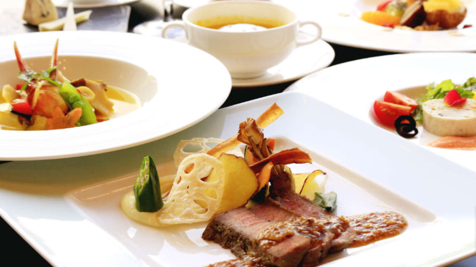 メインダイニングルーム内は、優雅な大沼の四季を映し出す、壁一面の窓が印象的。シェフが厳選した食材を取り入れたディナーコースに、ソムリエおすすめのアルコールを合わせれば、より味わい深くなりますね。地元七飯町産のはこだて大沼黒牛やキンキ、ひこま豚など、地元の食材がふんだんに使われているのが魅力です。