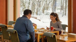 お楽しみの朝食は、窓の外に中庭が広がる開放的なレストランで。洋食・和食・スープカレーの3つの中から好きなものを1つ選ぶスタイルで、どのメニューも北海道産と十勝産の食材がたっぷりと使われているのが特徴。