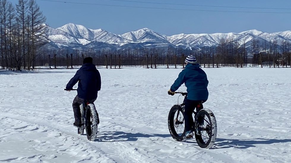 イチオシは、雪上ファットバイク(自転車)とチーズフォンデュが楽しめるプラン。芽室町の広大な雪原をフィールドに、寒冷地仕様のファットバイクで走行体験ができるんです! 一面銀世界の中を走り抜ける心地よい爽快感を体感できますよ。