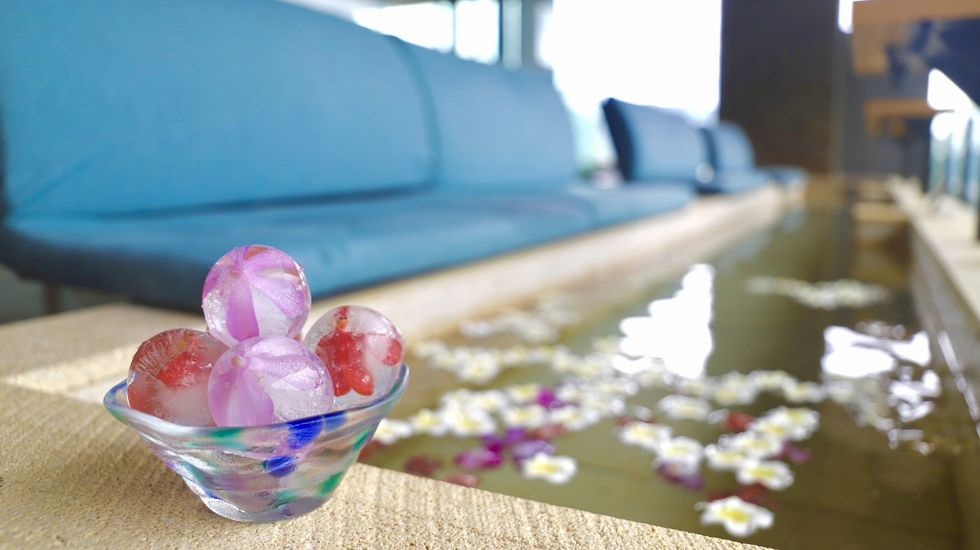 人気の足湯温泉は、夏季限定仕様の「花氷足湯」に。敷地内から湧き出る湧水が使用され、行き場をなくした花々「フラワーロス」が癒しの空間を演出。暑くなった足元と心のクールダウンにおすすめです。ぜひ天悠ならではのイベントに参加して夏を満喫してくださいね!
