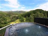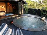 全8室の離れ客室でも、一番標高が高い場所に位置する特別室「佳月」。足湯付きの囲炉裏や月見台など、普段体験することのない贅沢な空間に心躍ります。ヒノキの浴槽でつながった内湯と露天は、10名は入れるほどの広さ!