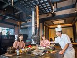 板前が配膳から説明までしっかり行ってくれる特別感たっぷりの夕食。A5ランクの豊後牛や、阿蘇王のサーロインは客室の囲炉裏を使って好みの焼き加減で食べられます。基本は部屋食ですが希望者はレストランも利用可能。