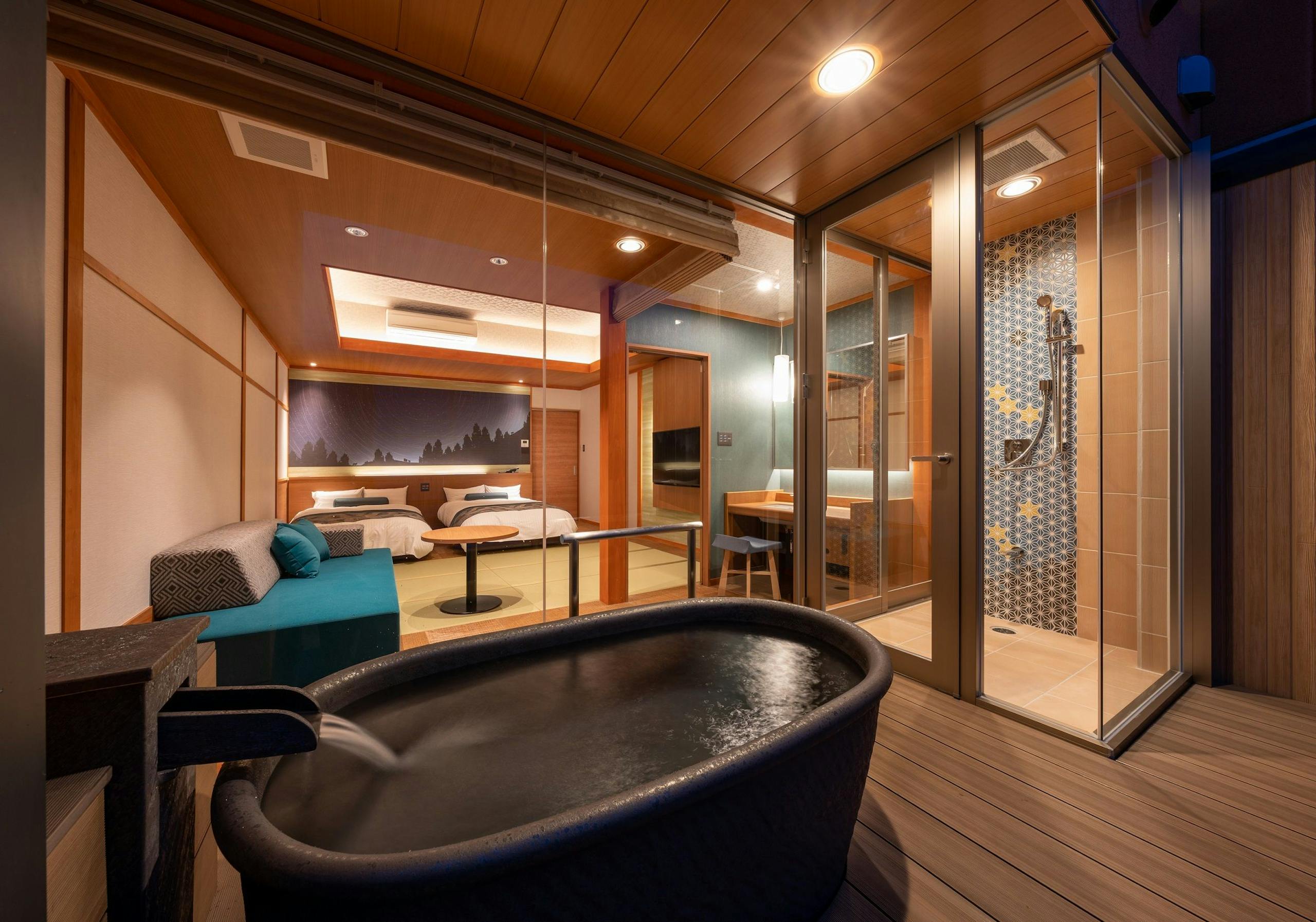 自家源泉かけ流しの露天風呂では、肌をやさしく包み込むとろりとした湯に癒されながら、夜には頭上いっぱいに広がる星空が湯面に映り、まるで星の海に身をゆだねるかのよう。広々とした館内は気品に満ち、四季の景観を楽しめる客室や庭園も魅力です。