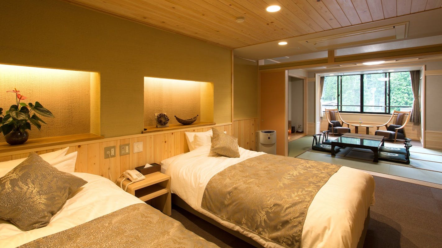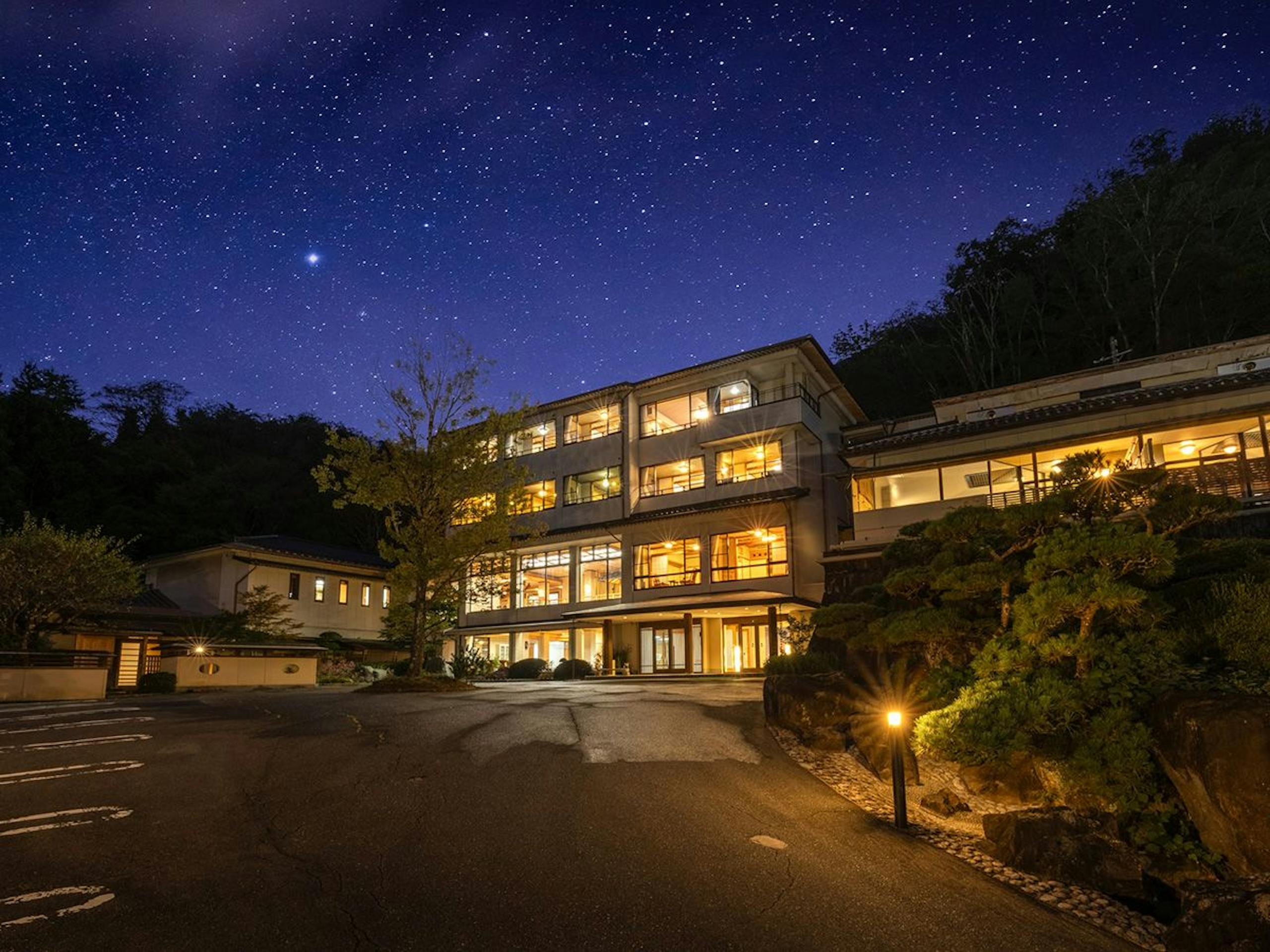 客室は静寂に包まれ、窓の向こうに広がる渓谷の緑と夜空の星々が、四季の情景とともに旅人を魅了します。昼神の名湯を引く大浴場・露天風呂では、幻想的な湯けむりの中に星が瞬く上質なひとときを。夕食は旬の食材を使った懐石料理で、一皿ごとに職人の技が光ります。