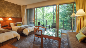 軽井沢駅から徒歩圏内の「軽井沢プリンスホテル ウエスト」は、観光やショッピング、ゴルフなど、アクティブに軽井沢を楽しみたいカップルに最適なホテルです。庭続きに徒歩約1分の場所にある「軽井沢プリンスホテルゴルフコース」は、初心者や女性も楽しめるフラットなコースレイアウトで、カップルで気軽にプレーができますよ。「デラックス テラス ツイン」は窓の外にテラスがあり、軽井沢の自然とのつながりが感じられる客室です。ワークスペースが2カ所設置され、ワーケーションで訪れたカップル旅行でも重宝します。温泉棟「MOMIJI HOT-SPRING」には、秋には見事な紅葉が見られる露天風呂やフィンランド式サウナも完備。自然に囲まれた場所で、心ゆくまで癒しの時間を過ごしてください。