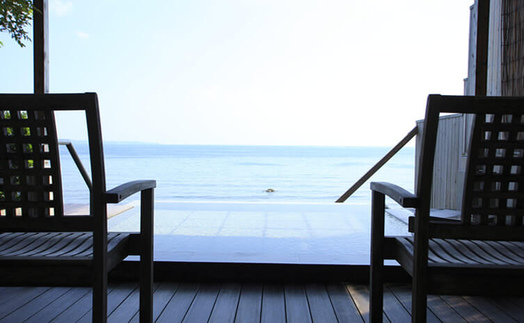 宿の客室はすべてオーシャンビューで、海側に源泉かけ流しの露天風呂が備わる。落ち着いた和の空間を取り入れた「晴れの棟」はのんびりと旅情を楽しみたい方におすすめ。海に面したテラスが設けられた「海の棟」は、海との一体感が味わえます。宿が誇る美しい景色と波音に包まれた部屋で心豊かな時間を存分に楽しめるはず。