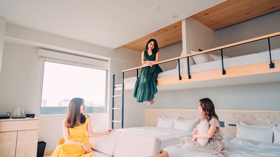 ユーグレナ石垣港離島ターミナルの向かいに建つ「THIRD石垣島」。「自分にとって心地よい場所に帰る」=「サードプレイス」をコンセプトにデザインされた館内は、どこを切り取っても絵になるおしゃれな空間が広がっています。