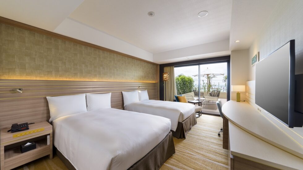 目の前に海が広がるリゾート感満載のホテル「ダブルツリーbyヒルトン沖縄北谷リゾート」は、「美浜アメリカンビレッジ」に隣接する便利な立地が魅力。プールも充実しており、北谷・読谷エリアで子連れが利用しやすいホテルです。子ども用プールはもちろん、スライダーも人気。さらに、隣接する「ヒルトン沖縄北谷リゾート」のプールも利用できるから、子連れ旅行の楽しさも倍増しますよ。客室はテラス付きで広々と使える、「プレミアムルーム オーシャンビューwithテラス」がおすすめ。20平米の広いテラスにはデッキチェアやパラソルが置かれ、リゾート感もバッチリ。オーシャンビューが広がる贅沢なホテルで、のんびりと子連れ旅行を楽しんでくださいね。