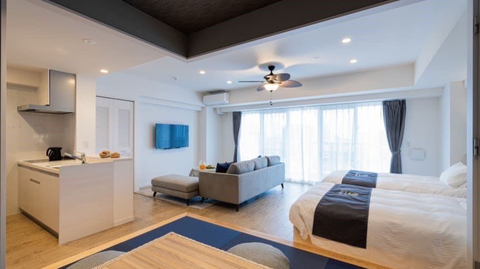 アクアパレス北谷 by コルディオプレミアムは、全室75平米以上の広々とした和洋室コンドミニアムで、ミニキッチンや調理器具、洗濯機・乾燥機完備とファミリーにうれしい設備が充実しています。畳スペースもあり、小さな子ども連れでも安心して過ごせます。屋上のインフィニティプールは宿泊者限定で、北谷の街並みを一望しながら家族でリラックスできます。徒歩圏内に飲食店やアメリカンビレッジもあり、食事や観光にも便利です。さらに、別邸「結の家Ⅰ・Ⅱ」や「クローバー」では最大11名まで宿泊可能な広々空間を提供し、大家族やグループ旅行にも対応。子ども向けおもちゃセットやオンライン診療提携など、子連れ旅行の安心をサポートするサービスも充実しています。ファミリーでの沖縄滞在に最適なホテルです。