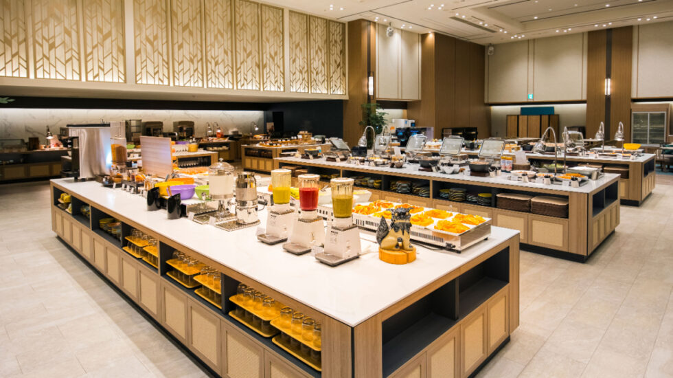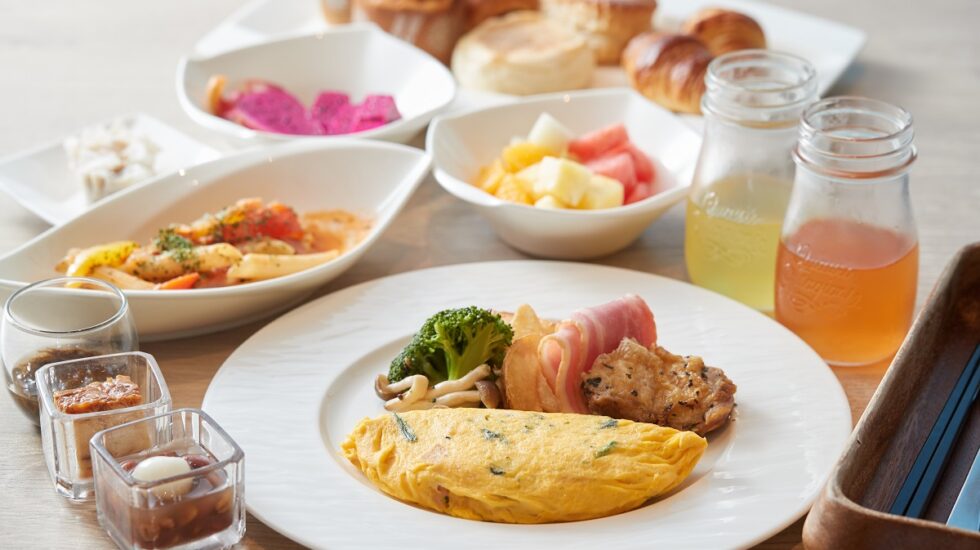 北谷町・読谷村の中でも特に美しいサンセットが見られるホテル「ダブルツリーbyヒルトン沖縄北谷リゾート」。北谷町エリアの中でも人気の観光スポット「美浜アメリカンビレッジ」がすぐそばにあり、観光の拠点としても最適なホテルです。客室には沖縄の砂浜とビーチをイメージしたインテリアが施され、全ての部屋から北谷町の海が見られるよう設計されているんだそう。ホテル内のレストラン「マティーラ」での朝食は60種類以上のメニューがビュッフェ形式で楽しめます。キラキラと輝く北谷の海を眺めながらおいしい朝食をとれば、きっと爽やかな朝を迎えられるはず。朝食ビュッフェには、もずく酢など沖縄の定番料理やライブキッチンメニューにデザートなど、海外のおしゃれなカフェのような華やかなメニューが並びます。